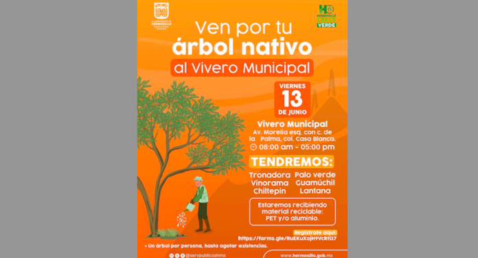 Hermosillo, Sonora.- El área de Parques y Jardines de Servicios Públicos Municipales prepara una nueva campaña de donación de 500 árboles nativos de la región el próximo viernes 13 de junio, anunció Amparo Fontanot, directora de dicha dependencia.