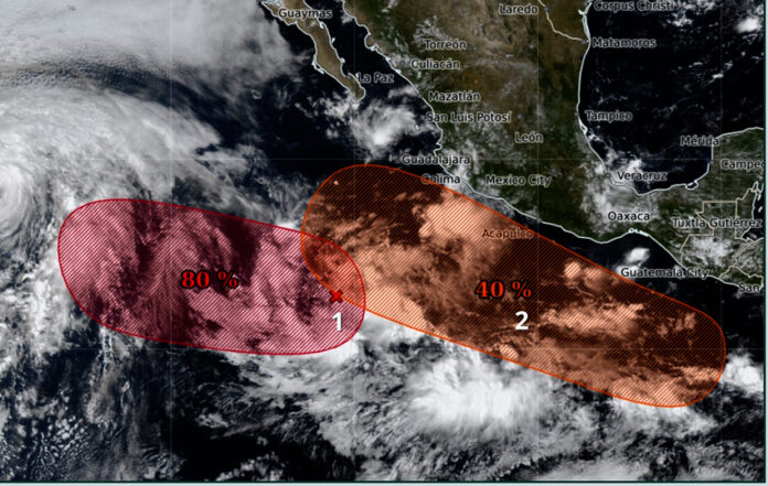 Uno de estos sistemas se localizaba esta mañana frente a las costas de Jalisco, y la otra, frente a las costas de Michoacán, Oaxaca y Guerrero.