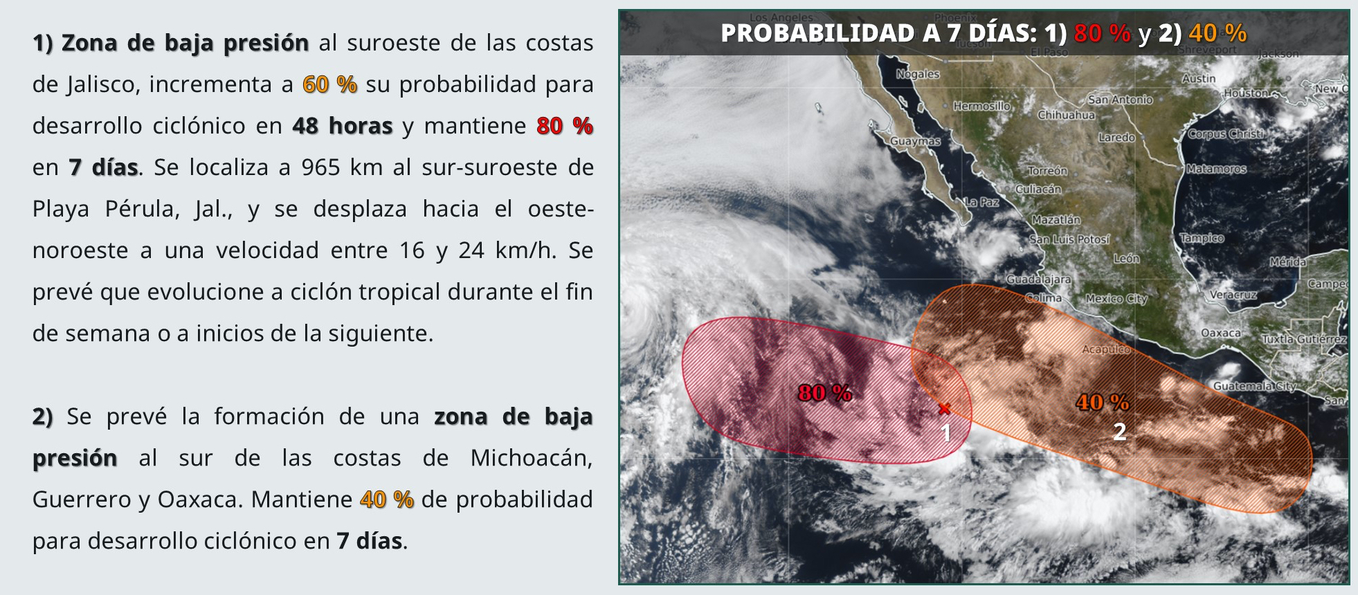 Dos zonas de baja presión en el Pacífico; con potencial de desarrollo ciclónico dentro de los próximos 7 días.