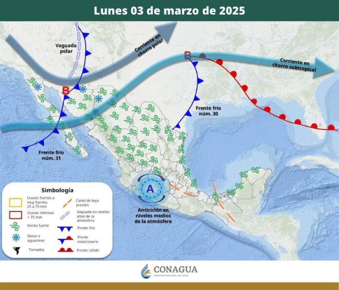 Durante hoy el *frente frío (No. 31)* ingresará y se desplazará sobre el noroeste del territorio mexicano, y al interaccionar comuna vaguada polar en el suroeste de Estados Unidos y con la corriente en chorro subtropical, generará rachas de viento fuertes a muy fuertes sobre todo el estado de Sonora. También la probabilidad de lluvias aisladas sobre el noroeste y norte de la entidad y de caída de aguanieve sobre los puntos más altos de la sierra.
