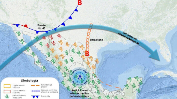 Durante hoy, el frente frío No. 43 se extenderá e interaccionará con la corriente en chorro subtropical, originando vientos fuertes con rachas de 60 km/h a 90 km/h con posibles tolvaneras sobre todo noreste y oriente de Sonora. A su vez, originará cielos parcialmente nublados con baja probabilidad de lluvia y un ligero descenso en las temperaturas con amaneceres frescos sobre municipios de la Sierra Madre Occidental. Por su parte, las temperaturas máximas disminuirán ligeramente y oscilarán entre 35 a 40°C en todo el estado.
