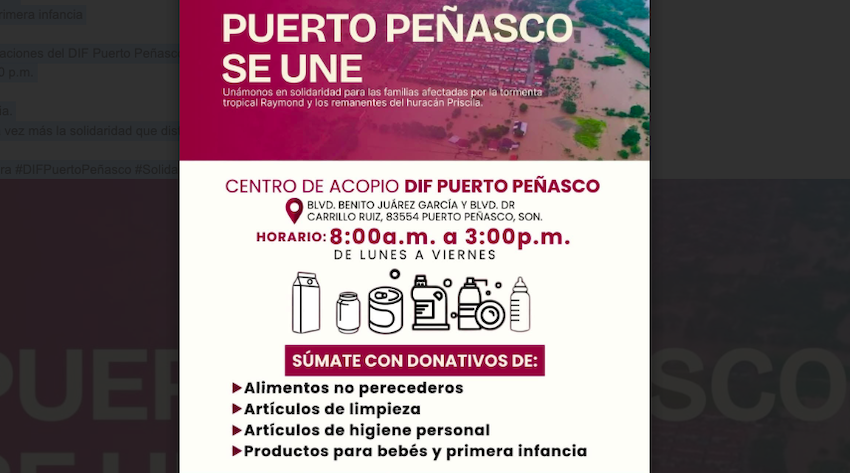 Inicio El Gobierno de Puerto Peñasco se suma al Centro de Acopio DIF Sonora El Gobierno de Puerto Peñasco se suma al Centro de Acopio DIF Sonora; en solidaridad con las familias afectadas por la tormenta tropical Raymond y los remanentes del huracán Priscila.