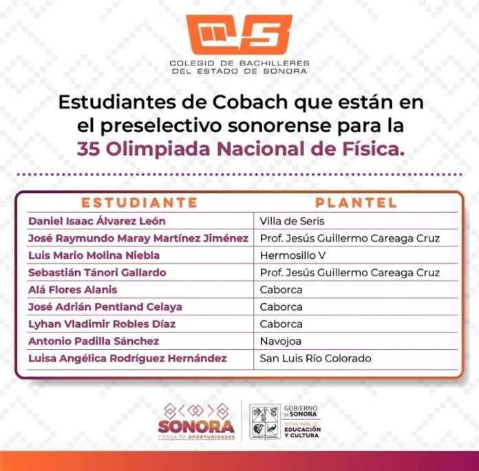 Hermosillo, Sonora.- Después de superar varias etapas de exámenes, estudiantes del Colegio de Bachilleres del Estado de Sonora (Cobach) conforman, en su mayoría, la preselección sonorense que busca participar en la 35 Olimpiada Nacional de Física 2024, informó Rodrigo Arturo Rosas Burgos.