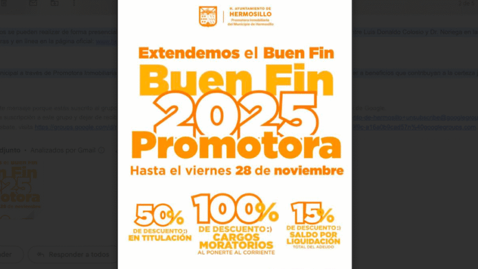 Hermosillo, Sonora.- En apoyo a las familias hermosillenses, el Gobierno Municipal, a través de Promotora Inmobiliaria del Municipio de Hermosillo, extiende hasta el viernes 28 de noviembre los descuentos del Buen Fin 2025.