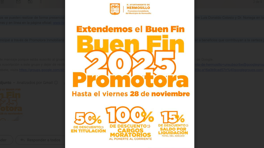 Extiende Promotora Inmobiliaria de Hermosillo descuentos del Buen Fin 2025; hasta el viernes 28 de noviembre con grandes descuentos en titulación, cargos moratorios y saldos por liquidación.