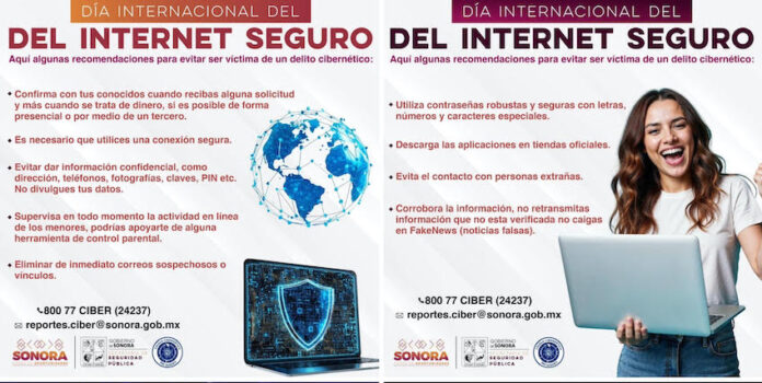 Hermosillo, Sonora.- Para conmemorar el “Día de Internet Seguro”, el Gobierno de Sonora refrendó el compromiso de mantener informada a la ciudadanía, emitiendo recomendaciones permanentes para prevenir sean víctimas de delitos cibernéticos.