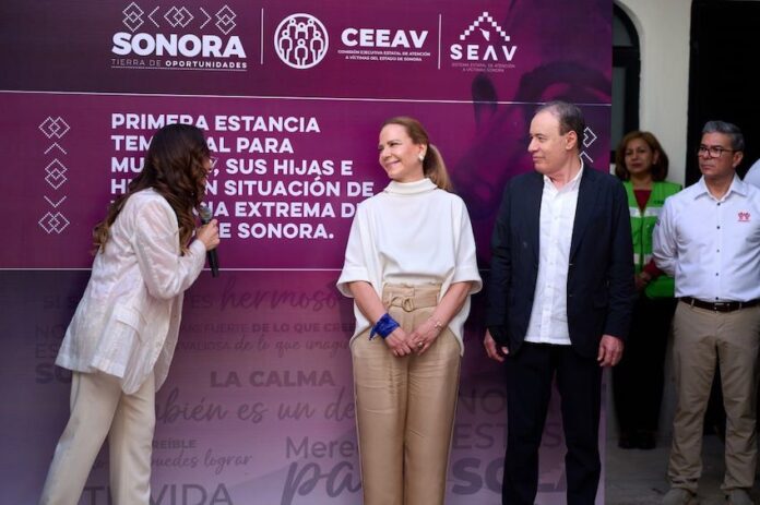 El mandatario estatal, junto a Rocío Chávez Murillo, presidenta honoraria del Sistema DIF Sonora, explicó que la estancia temporal es un modelo pionero de atención a víctimas, que integra protección inmediata, cuidado especializado, desarrollo económico y generación de espacios seguros, a través de apoyos psicológicos, alimentarios, becas educativas, capacitación para el trabajo, financiamiento de proyectos productivos, acceso a vivienda, créditos para mujeres y cobertura de salud.