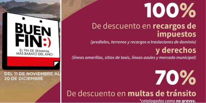 Durante estos días, habrá 100 por ciento de descuento en recargos de impuesto (predial, terrenos y recargos a traslaciones de dominio), derechos (líneas amarillas, sitios de taxis, líneas azules y Mercado Municipal) y el 70 por ciento de descuento en multas de tránsito (catalogadas como no graves) a través del programa.