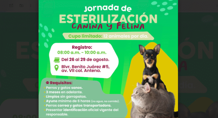 Guaymas, Sonora.- Para procurar el bienestar de nuestras mascotas, del 26 al 29 de agosto habrá Jornada de esterilización canina y felina impulsada por el Ayuntamiento de Guaymas a través de Desarrollo Social y Salud Pública Municipal.