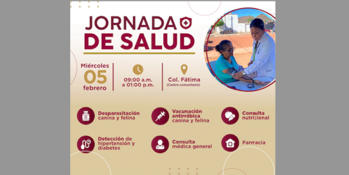 Guaymas, Sonora.- Los servicios de la Jornada de Salud estarán presentes este miércoles 5 de febrero de 9:00 de la mañana hasta las 13:00 horas en la colonia Fátima (Centro Comunitario) para ofrecer gratuitamente atención a todas las familias, comentó Austria Castro Gracia.