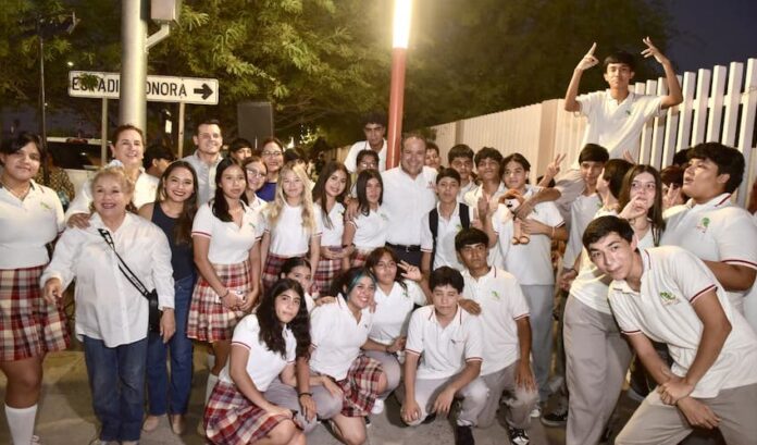 Recibieron a Toño Astiazarán decenas de alumnas y alumnos y el director del plantel César Antonio Tristán y la señora Rebeca Mesa Dessens, presidenta del comité vecinal CRECES de La Manga y juntos corearon la cuenta regresiva con que se encendieron las 33 luminarias LED tipo bolardo de este corredor.