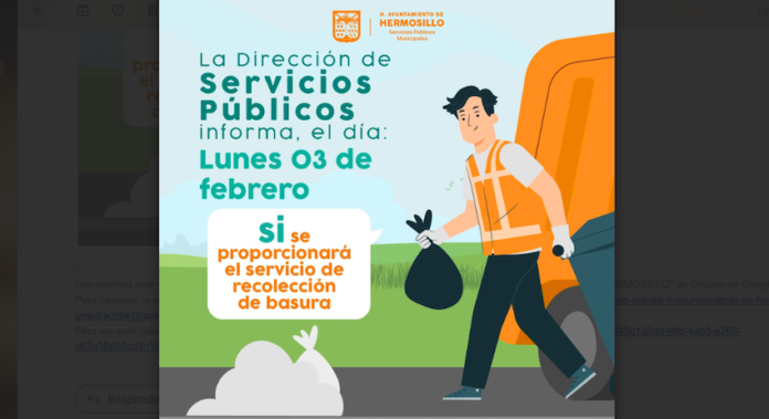 Hermosillo, Sonora.- El servicio de recolección de basura se realizará de manera normal este lunes 3 de febrero, aunque esté definido como día inhábil por el aniversario de la promulgación de la Constitución Mexicana.