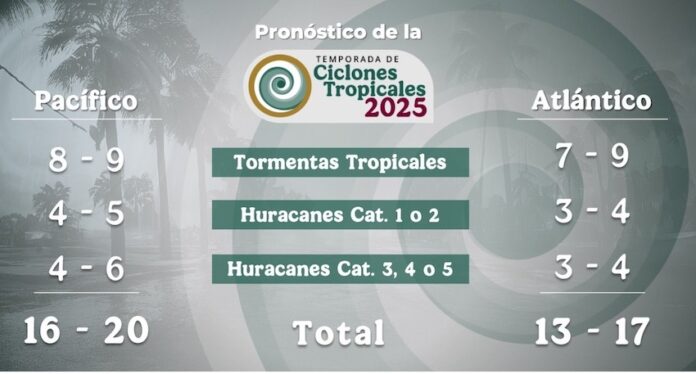 – Océano Pacífico: entre 16 y 20 sistemas tropicales, de los cuales entre 8 y 11 podrían alcanzar categoría de huracán.