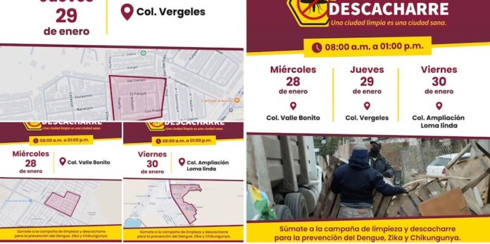 Detalló que el recorrido será el 28 de en Valle Bonito, el 29 en Vergeles y el 30 en Ampliación Loma Linda, por lo que reiteró la invitación a las familias a limpiar sus patios y sacar aquellos artículos que puedan representar un riesgo para la salud.