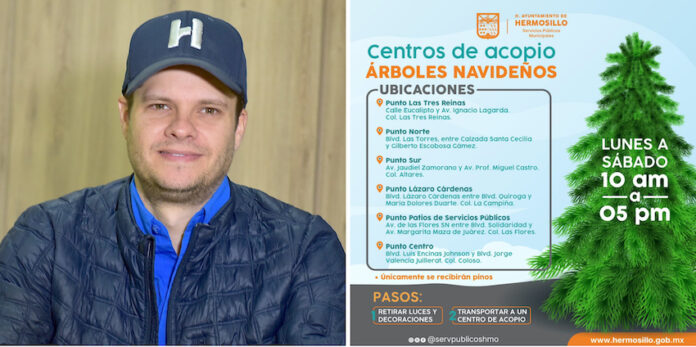 Hermosillo, Sonora.- Una invitación a depositar árboles navideños en los seis centros de acopio disponibles en Hermosillo, extendió la dirección de Servicios Públicos Municipales donde se recibirán pinos naturales de lunes a sábado en un horario de 10:00 a 17:00 horas.