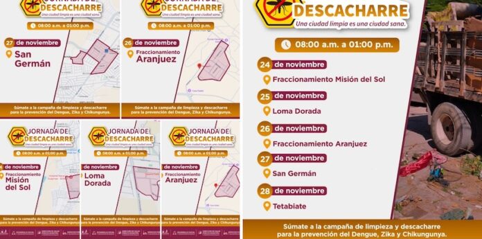 Guaymas, Sonora,.- Del 24 al 28 de noviembre serán las visitas que a través de la Jornada de descacharre realice el Ayuntamiento de Guaymas a colonias, como parte de las acciones para prevenir dengue, zika y chikungunya en la localidad y mantener limpia la ciudad.