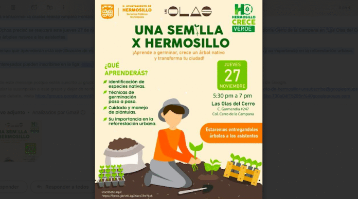 Hermosillo, Sonora- Una invitación a las y los hermosillenses a asistir al taller gratuito “Una Semilla X Hermosillo” donde aprenderán a germinar y crecer un árbol nativo para contribuir a transformar la ciudad realizó Amparo Fontanot Ochoa, directora de Parques y Jardines de Servicios Públicos Municipales.