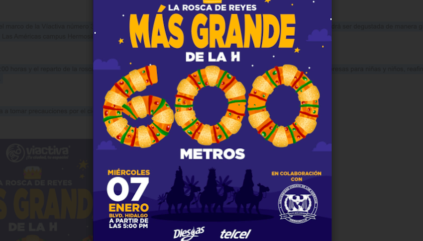 Inicio Invita Gobierno Municipal a la Rosca Más Grande de La H el miércoles 7 de enero Invita Gobierno Municipal a la Rosca Más Grande de La H el miércoles 7 de enero; las familias hermosillenses podrán disfrutar gratuitamente de la tradicional rosca de 600 metros durante la primera Víactiva especial del año.