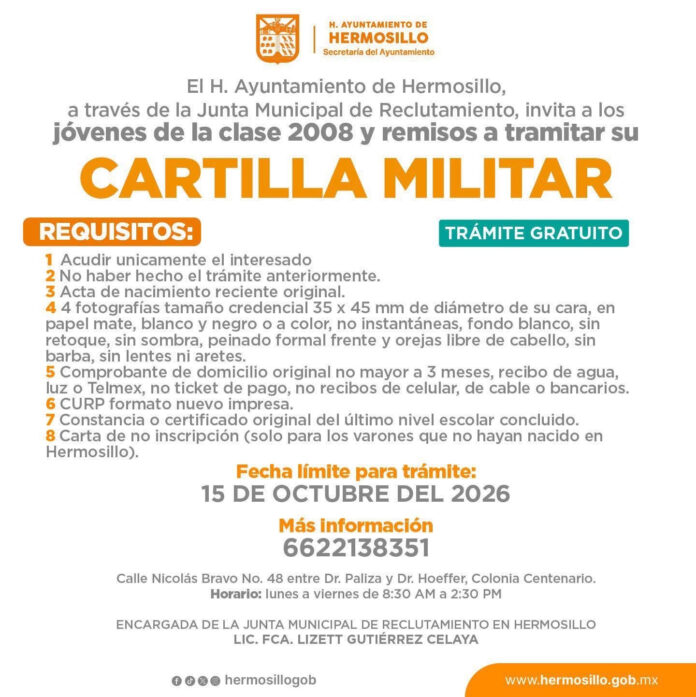 Hermosillo, Sonora.- El personal de la dirección de Servicios de Gobierno de la Secretaría del Ayuntamiento de Hermosillo ya está listo para atender a los jóvenes clase 2008 y remisos para asistirlos en el trámite por primera vez de su cartilla del Servicio Militar Nacional, conforme a la convocatoria 2026, informó Eduardo Acuña Padilla.