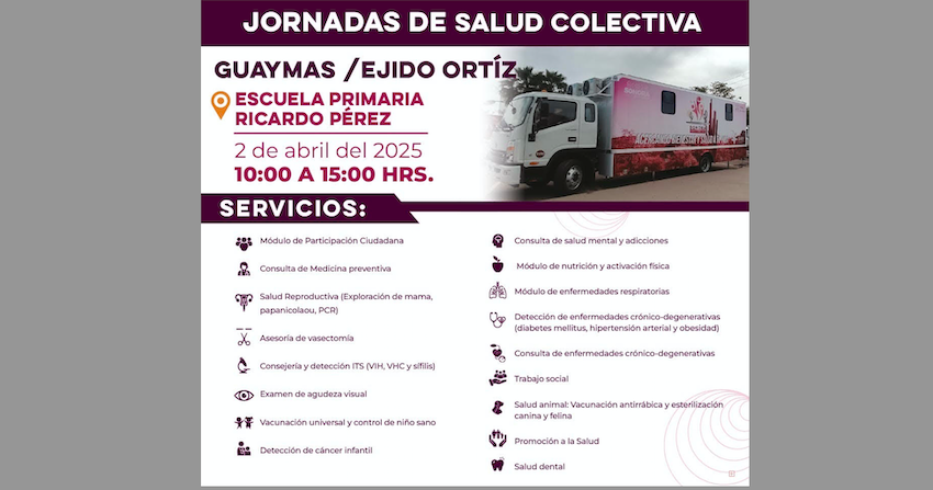 Invitan a la Jornada de salud colectiva en el ejido Ortiz este, este 02 de abril de 10:00 a.m. a 15:00 horas en las instalaciones de la Escuela primaria Ricardo Pérez.