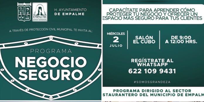 Empalme, Sonora.- Con el objetivo de fortalecer la cultura de la prevención y garantizar mayor seguridad en los establecimientos comerciales del municipio, el Ayuntamiento de Empalme, que preside el alcalde Luis Fuentes Aguilar, a través de la Secretaría del Ayuntamiento y Protección Civil, invita a restauranteros de comercio fijo y semifijo a sumarse al programa “Negocio Seguro”.