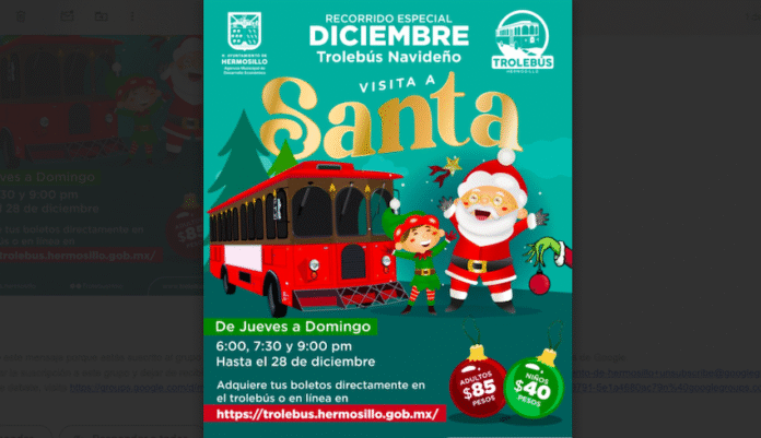 Hermosillo, Sonora.- El Ayuntamiento de Hermosillo, por medio de la Dirección de Desarrollo Turístico, invita a las familias hermosillenses a disfrutar del Trolebús Navideño, un recorrido especial que ofrece un ambiente navideño y la oportunidad de visitar la Casa de Santa Claus del jueves 4 hasta el 28 de diciembre.