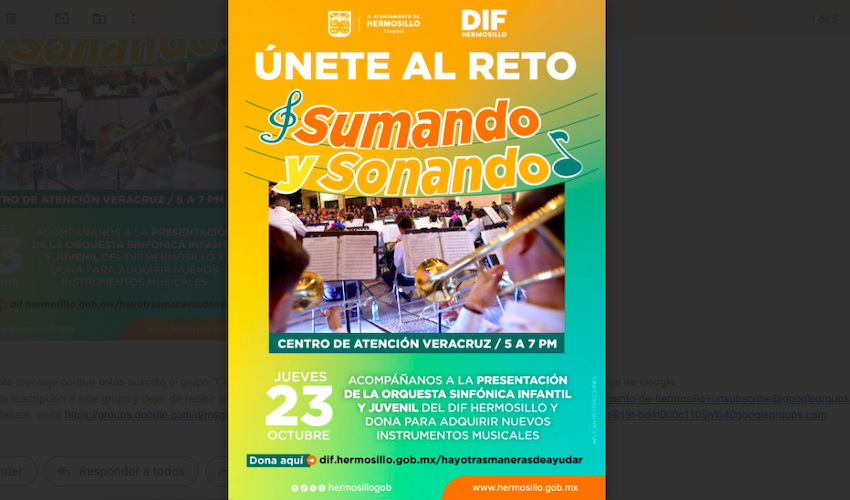 Inicio Invitan Tesorería Municipal y DIF Hermosillo unirse al reto para apoyar a la Orquesta Sinfónica Infantil y Juvenil Invitan Tesorería Municipal y DIF Hermosillo unirse al reto para apoyar a la Orquesta Sinfónica Infantil y Juvenil; la orquesta se presentará este 23 de octubre en el centro de atención de Tesorería de Veracruz, a partir de las 17:00 horas.