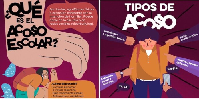 La dependencia explicó que el acoso escolar, también conocido como bullying, se manifiesta a través de burlas constantes, agresiones físicas o exclusión intencional, con el propósito de humillar o dañar emocionalmente a la víctima.