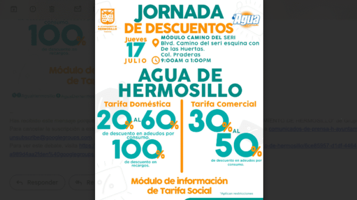 Hermosillo, Sonora.- Este jueves 17 de julio el organismo operador Agua de Hermosillo llevará jornada de descuentos en el módulo ubicado en bulevar Camino del Seri y De las Huertas, en la colonia Praderas.
