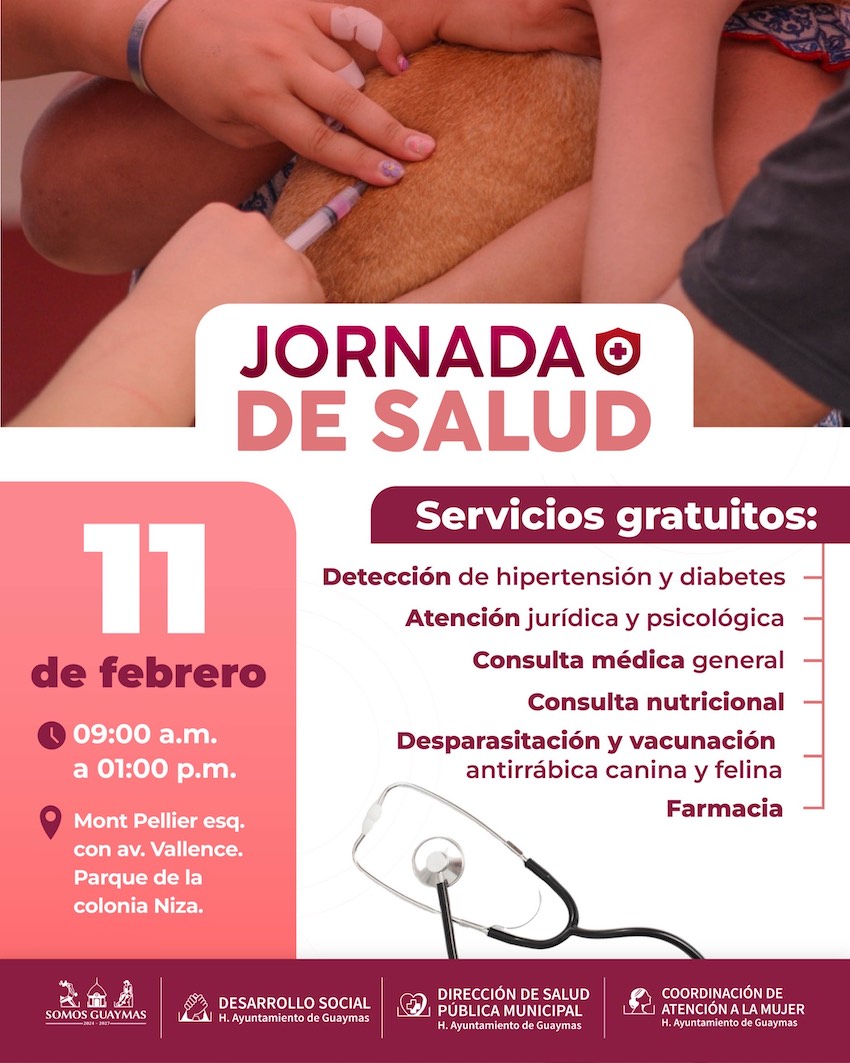 #Guaymas Lleva el Ayuntamiento de Guaymas Jornada de Salud a Niza; este próximo miércoles 11 de febrero en el parque de dico sector, en un horario de 9:00 de la mañana hasta las 13:00 horas.