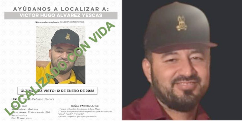 #PuertoPeñasco Localizado sano y a salvo; andaba de parranda con dos mujeres y un amigo; Víctor Hugo había sido reportado como desaparecido por sus familiares en Puerto Peñasco; ya está con su familia.