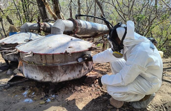 Cosalá, Sinaloa.- La Secretaría de Marina a través de la Armada de México, por conducto de la Octava Zona Naval, informa que ayer, elementos navales en coordinación con personal de la Fiscalía General de la República (FGR) localizaron y neutralizaron un Laboratorio Clandestino presuntamente dedicado a la producción de metanfetamina, en inmediaciones del poblado La Palma, municipio de Cosalá, Sinaloa.