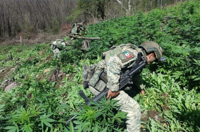 Los elementos del Ejército Mexicano, en coordinación con la Guardia Nacional, la Secretaría de Marina, la Secretaría de Seguridad y Protección Ciudadana, la Fiscalía General de la República, la Fiscalía General del Estado y la Secretaría de Seguridad Pública de Sinaloa, a través de la Policía Estatal Preventiva, localizaron 18 plantíos de marihuana y amapola en el municipio de Badiraguato.