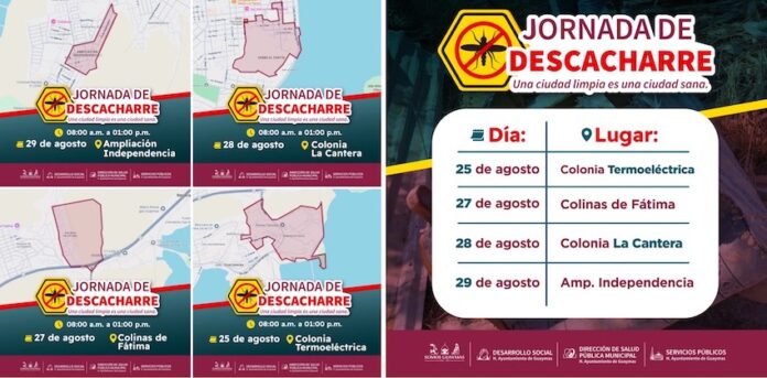 Guaymas, Sonora.- En busca de que Guaymas sea una ciudad limpia y se prevengan casos de dengue, zika y chikungunya, esta próxima semana se realizará la Jornada de descacharre en las colonias Termoeléctrica, Colinas de Fátima, La Cantera y Ampliación Independencia.