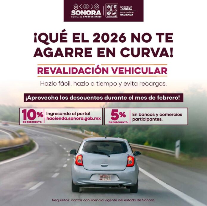 Hermosillo, Sonora.– La Secretaría de Hacienda del Gobierno de Sonora informó que durante el mes de febrero continúan vigentes los incentivos por pronto pago de la revalidación vehicular 2026, como parte de las acciones para facilitar el cumplimiento oportuno de las obligaciones fiscales.