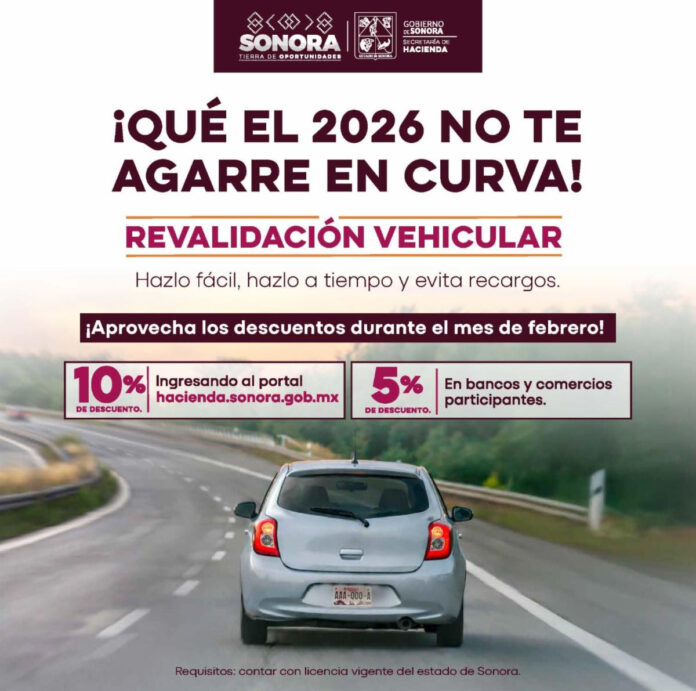Hermosillo, Sonora.- La Secretaría de Hacienda del Gobierno de Sonora informó que durante el mes de febrero continúan vigentes los incentivos por pronto pago de la revalidación vehicular 2026, como parte de las acciones para facilitar el cumplimiento oportuno de las obligaciones fiscales.