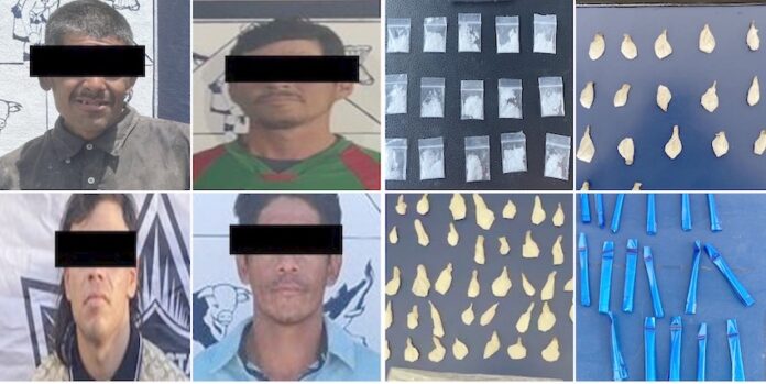 Con el trabajo coordinado con la Secretaría de Marina y Policía Municipal, arrestaron a Jorge “N”, de 21 años, en posesión de 17 envoltorios con narcótico en la colonia Hidalgo y en Campanario la PESP llevó a cabo la detención de Armando “N”, de 41 años, con 20 dosis de sustancia granulada.
