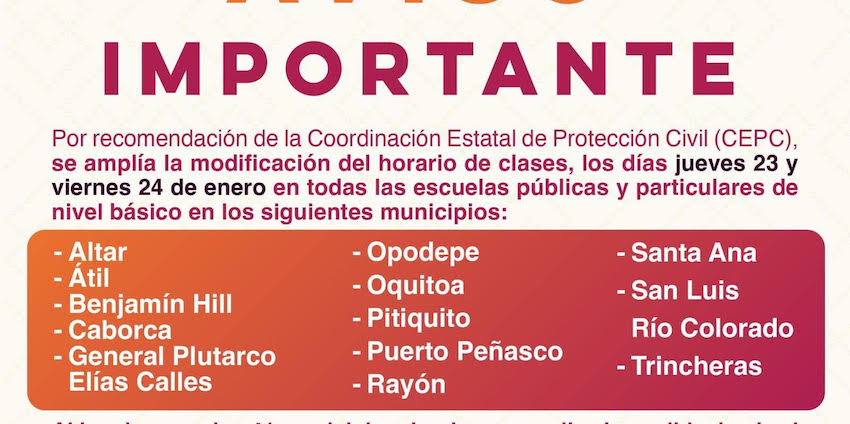 #SONORA Modificación de horario de clases se amplía a 13 municipios; por recomendación de Protección Civil, ante las bajas temperaturas.