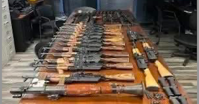 Tras una inspección más detallada, agentes localizaron un compartimento oculto donde se encontraba un tubo lanzagranadas tipo RPG, cuatro rifles, una pistola tipo AK, 16 rifles adicionales tipo AK, 24 cargadores, 16 culatas, 20 empuñaduras y diversas piezas para ensamblaje de armas.