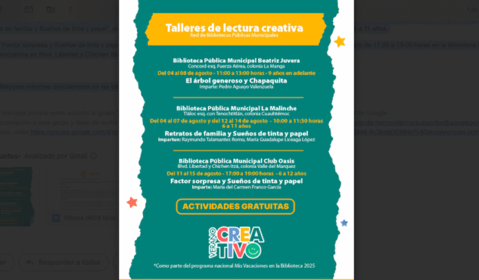 Hermosillo, Sonora.- Como parte del programa Verano Creativo y del programa nacional Mis Vacaciones en la Biblioteca 2025, el Ayuntamiento de Hermosillo, a través del Instituto Municipal de Cultura y Arte (IMCA) ofrecerá durante el mes de agosto, talleres de lectura creativa gratuitos para niñas y niños en tres bibliotecas de la Red de Bibliotecas Públicas Municipales.