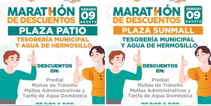 Hermosillo, Sonora.- A fin de facilitar que las personas con adeudos por contribuciones municipales y servicio de agua potable se pongan al corriente, la Tesorería Municipal y Agua de Hermosillo ofrecerán un doble Maratón de descuentos en dos sedes de la ciudad, este sábado 9 de agosto.