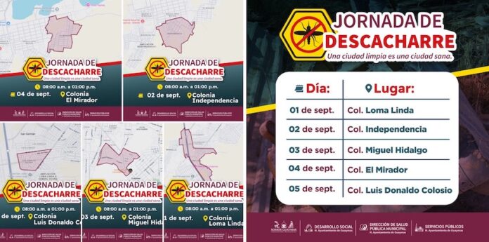 Guaymas, Sonora.- Mediante la suma de esfuerzos entre la comunidad y el gobierno municipal, del 1 al 5 de septiembre habrá Jornada de descacharre como una medida para la prevención del dengue, zika y chikungunya.