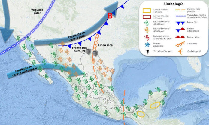 Para hoy ambiente de frío a fresco y fuertes rachas de viento sobre el norte y oriente; efectos del frente frío número 39 en combinación con una vaguada polar y las corrientes en chorro polar.