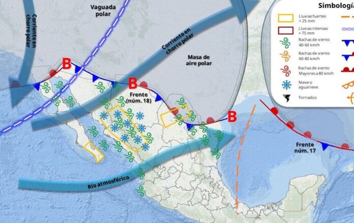 Para hoy, el frente frío (núm. 18) se extenderá con características de estacionario sobre el noroeste y norte del territorio nacional, continuará interaccionando con una vaguada en niveles medios y altos de la atmósfera, con la corriente en chorro polar y con un río atmosférico, generando descenso de temperatura, rachas de viento de hasta 60 km/h y lluvias de ligeras a moderadas sobre la región sur y oriente; además de probabilidad para la caída de nieve o aguanieve en la zona montañosa sur limítrofe con Chihuahua.