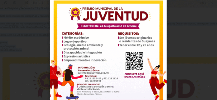 Empalme, Sonora.- Te presentamos la convocatoria para participar en el Premio Municipal de la Juventud que promueve el Instituto Sonorense de la Juventud en coordinación con el Ayuntamiento de Guaymas a través de Desarrollo Social y la Coordinación de Atención a la Juventud.