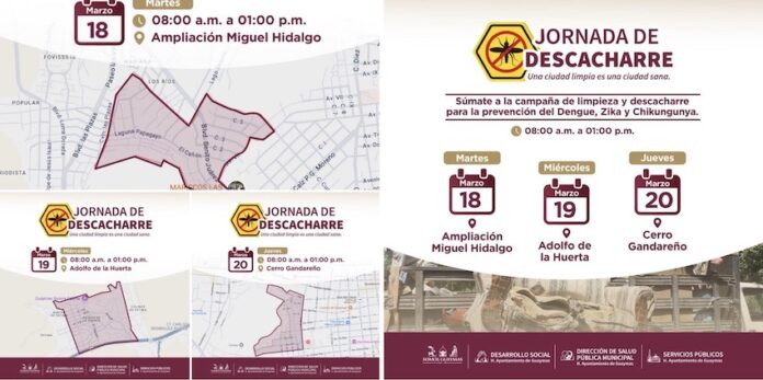 De manera conjunta, Desarrollo Social, Servicios Públicos y Salud Pública Municipal realizarán la Jornada de Descacharre en horario de 8:00 de la mañana hasta las 13:00 horas, iniciando este martes en sector Ampliación Miguel Hidalgo, miércoles en Adolfo de la Huerta y jueves 20 en el Cerro Gandareño, por lo que hace el llamado a sumarse a este trabajo.