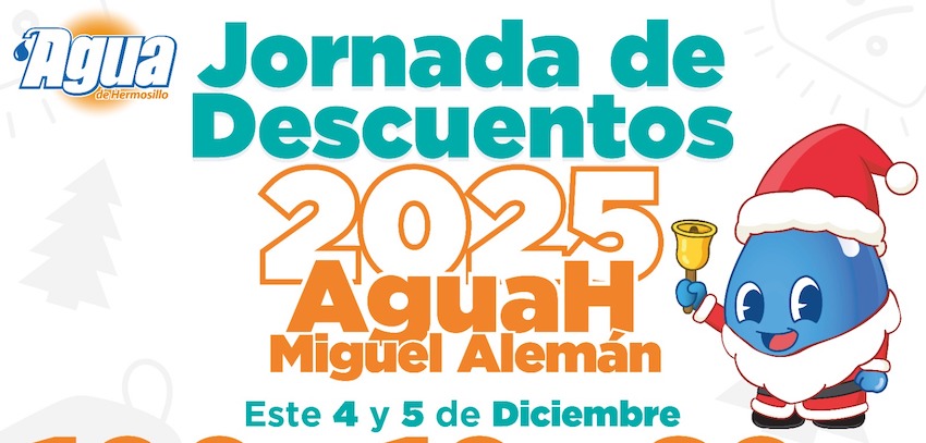 Inicio Realiza Agua de Hermosillo Jornada de Descuentos en Bahía de Kino, Miguel Alemán, San Pedro y La Victoria Realiza Agua de Hermosillo Jornada de Descuentos en Bahía de Kino, Miguel Alemán, San Pedro y La Victoria; los descuentos se ofrecerán los días 4 y 5 de diciembre.