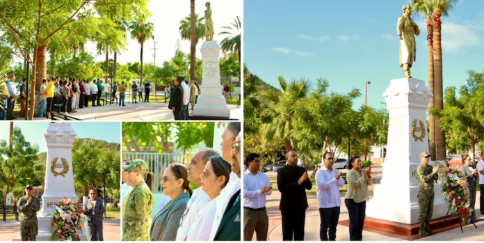 Guaymas, Sonora.- La doctora Karla Córdova González encabezó la colocación de ofrenda floral y guardia de honor en el monumento a Miguel Hidalgo y Costilla, «El Padre de la Patria», en la conmemoración del 214 aniversario del inicio de la Independencia de México.