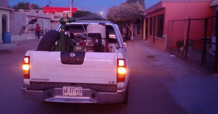 Empalme, Sonora.- Con la finalidad de reducir al mínimo las posibilidades de un brote de dengue, el Ayuntamiento, que preside el alcalde Luis Fuentes Aguilar, en coordinación con la Jefatura Sanitaria número 4, de la Secretaría de Salud, realizaron una intensa jornada de fumigación en el fraccionamiento Prado Bonito y colonia Infonavit Bahía del Sol.