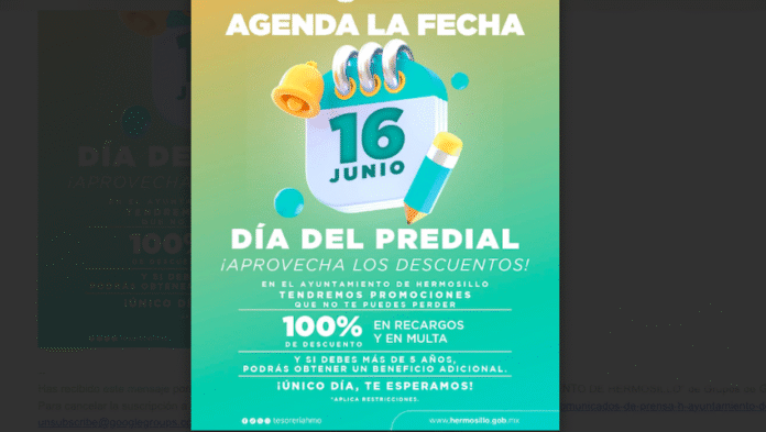 Hermosillo, Sonora.- El próximo lunes 16 de junio se celebrará el Día del Predial con promociones y descuentos muy amplios, para quienes tienen más de 5 años de adeudo, informó Yazmina Anaya Camargo.
